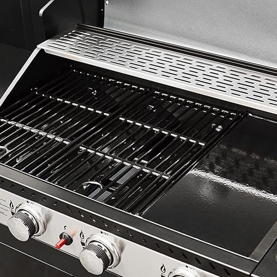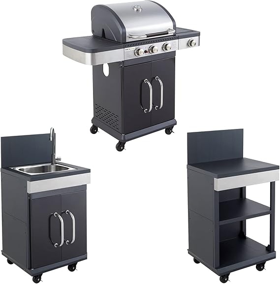 • Nombreuses fonctionnalités : le Barbecue dispose d’une partie „grill“ avec 2 brûleurs et une partie „plancha“ avec 1 brûleur. Mais ce n’est pas tout : il dispose également d’un réchaud latéral pour maintenir vos plats à température. De plus le capot est équipé d’un thermomètre afin de contrôler vos cuissons. La cuisine dispose de rangements et de roues multidirectionnelles équipées de freins. Quant à l’évier, il vous sera d’une grande aide pour laver vos aliments, vos plats ou vos mains, penda