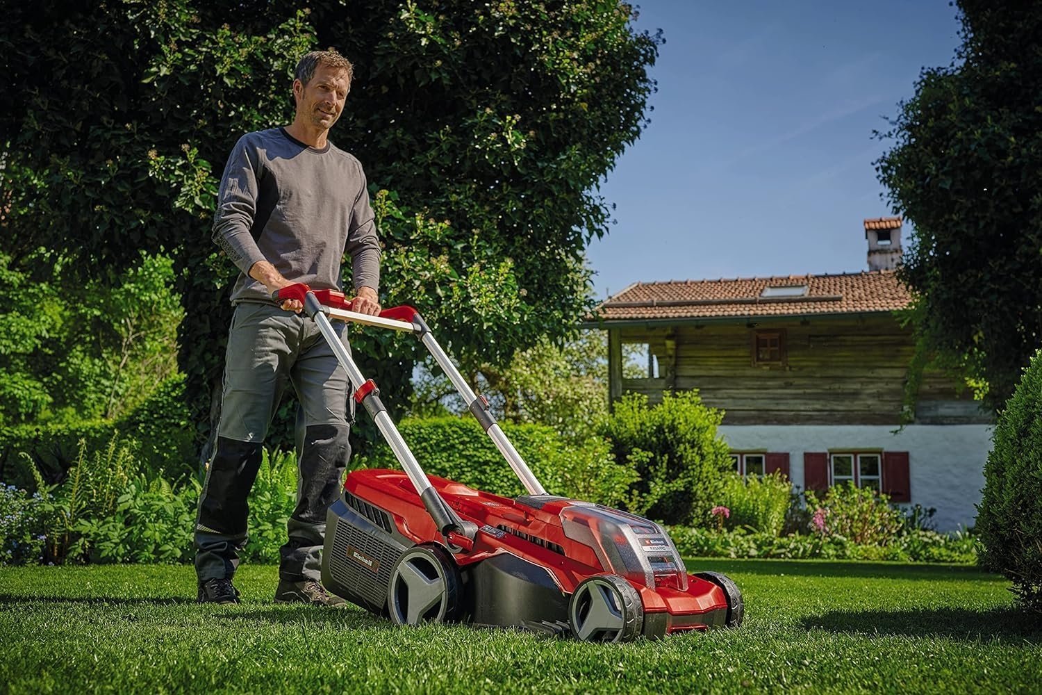 - De Einhell RASARRO 36/38 accu grasmaaier werkt krachtig en snoerloos op alle soorten gras in elke hoek van de tuin. De maaier wordt aanbevolen voor gazons tot 450 m² en wordt aangedreven door twee krachtige 4,0 Ah Power X-Change accu’s.