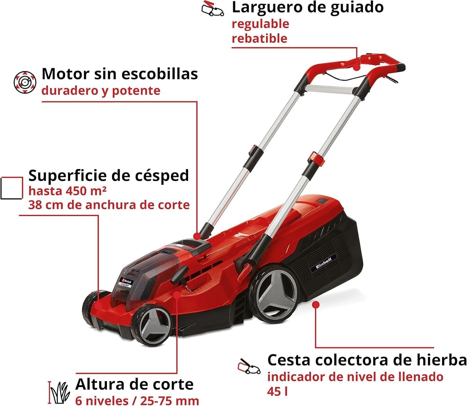- Dankzij de borstelloze energietechnologie en een borstelloze elektromotor kan deze accu grasmaaier geen enkel gras maaien zonder mechanische slijtage van de motor. De grasopvangbak van 45 liter heeft een laadniveau-indicator.