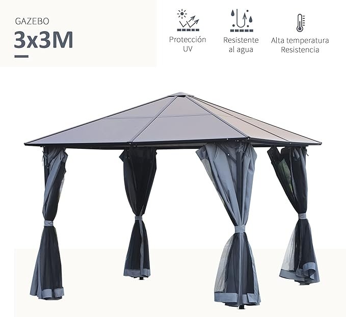 • TECHO RÍGIDO: El techo de este cenador ofrece más protección que un dosel tradicional, protege a tus invitados en el interior de la luz solar directa, los rayos UV y la lluvia de la forma más eficaz