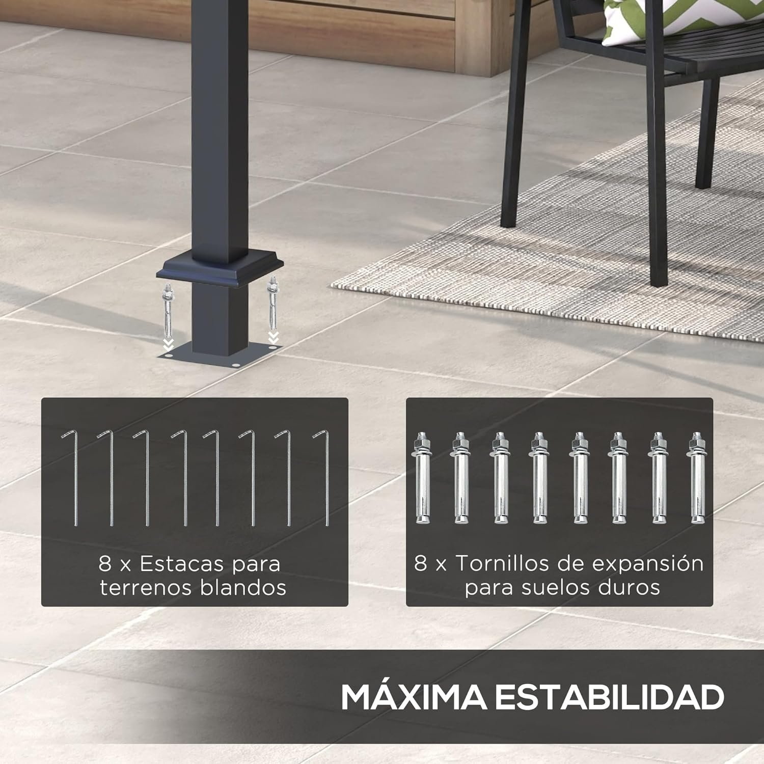 - ESTRUCTURA DE ACERO: La robustez de esta pérgola reside en su estructura de acero, que garantiza su estabilidad. Incluye 8 clavos de tierra y 8 tornillos de expansión para una fijación segura al suelo