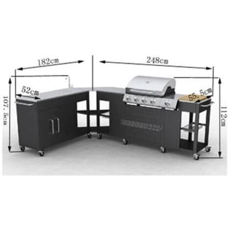 Rien n’est plus agréable que d’utiliser ce barbecue en acier inoxydable. Grâce à son armature souple, vous pouvez le disposer comme vous le souhaitez. Vous avez accès à 4 brûleurs puissants avec une capacité totale de 48.000 BTU/HR (14 KW), ainsi qu’un brûleur latéral. Il est équipé d’un évier intégré pour laver les légumes et d’une planche à découper. Ce barbecue offre également un espace de stockage pour vos plats et ingrédients, et un couvercle avec thermomètre pour surveiller la température. Il est adapté au butane, propane et LPG, et facile à déplacer grâce à ses roues. L’allumage du gaz se fait par un allumage électronique pour une sécurité optimale. Important : un tuyau et un régulateur de pression sont nécessaires pour le raccordement au gaz, mais ne sont pas fournis.