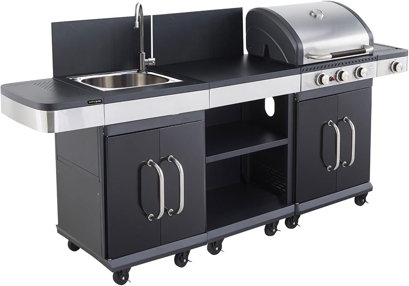 - Muchas características: la barbacoa tiene una parte de „parrilla“ con 2 quemadores y una parte „plancha“ con 1 quemador. Pero eso no es todo: también tiene una estufa lateral para mantener sus platos a temperatura. Además, el capó está equipado con un termómetro para controlar sus cocciones. La cocina tiene almacenamiento y ruedas multidireccionales equipadas con frenos. En cuanto al fregadero, será de gran ayuda para lavar sus alimentos, platos o manos, penda