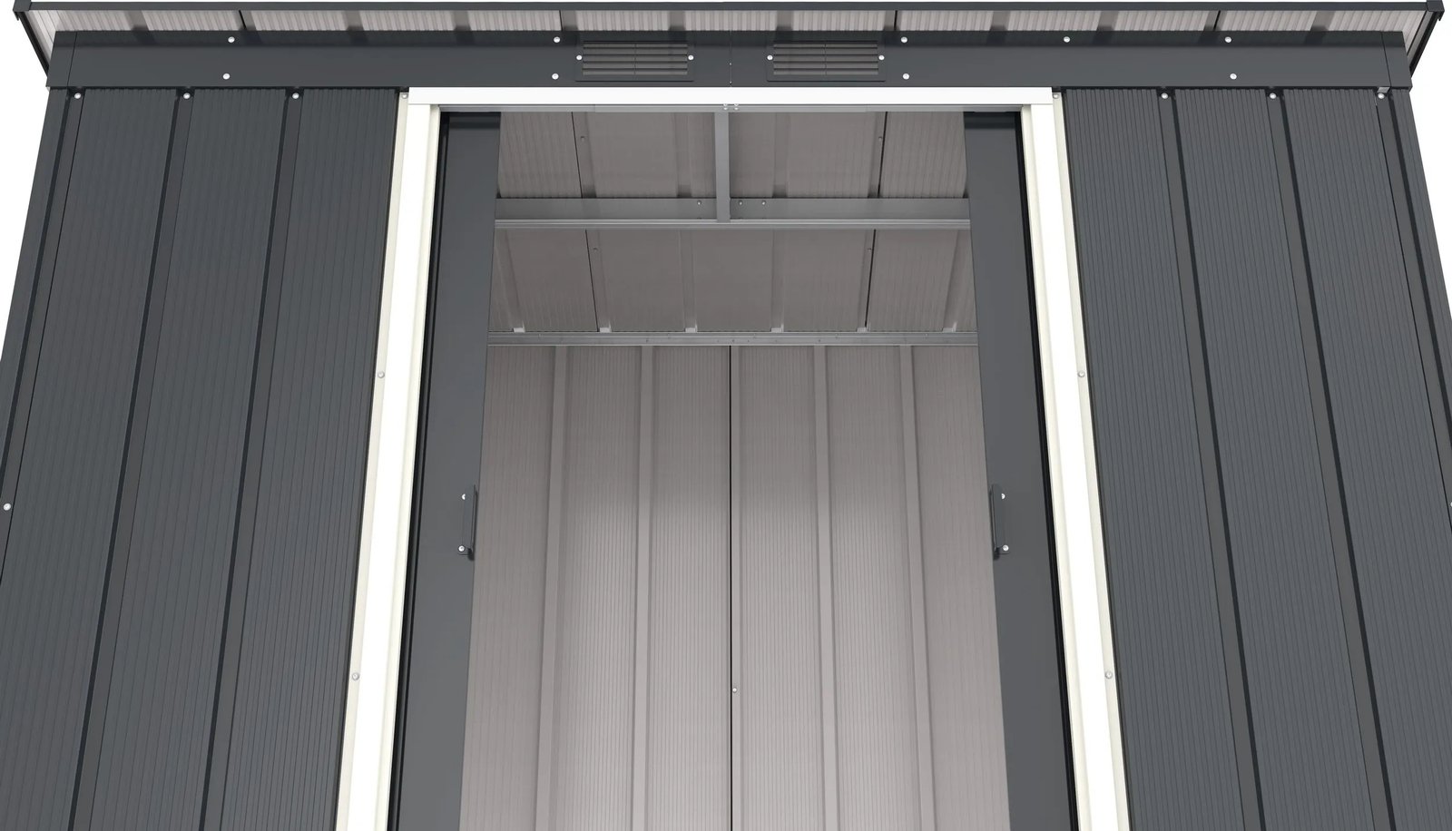 Dankzij het lessenaarsdak heeft deze berging direct een modern uiterlijk. Het dak loopt af met een hoek van zes graden, waardoor het water snel van het dak af zal glijden en je nooit last zal hebben van een laag water op het dak. Dankzij de antracieten kleur kun je deze berging in vrijwel elke tuinstijl tot recht laten komen. De berging heeft een goede luchtcirculatie dankzij de ventilatieroosters, waardoor condensvorming en schimmel voorkomen wordt. Daarnaast zijn de metalen panelen voorzien van een ribbelconstructie die zorgt voor extra stevigheid.