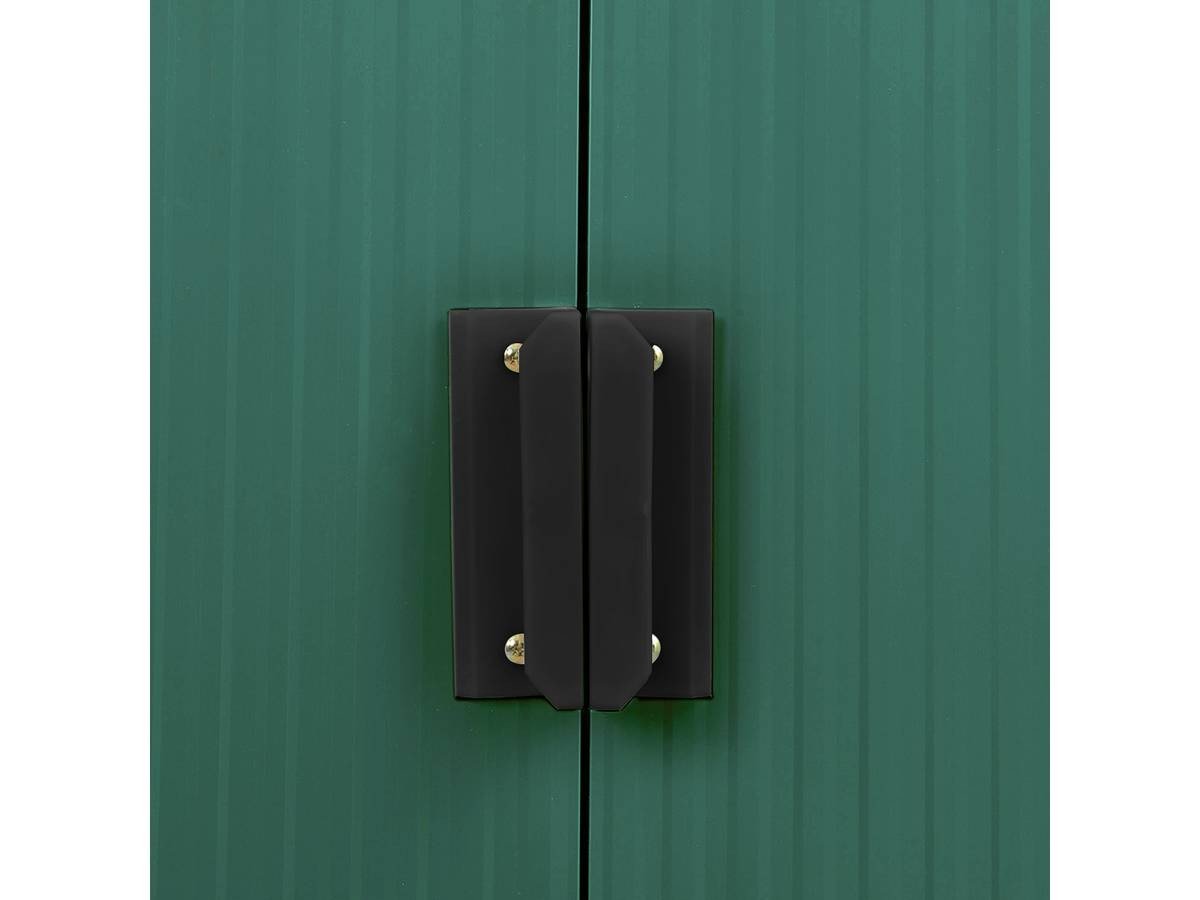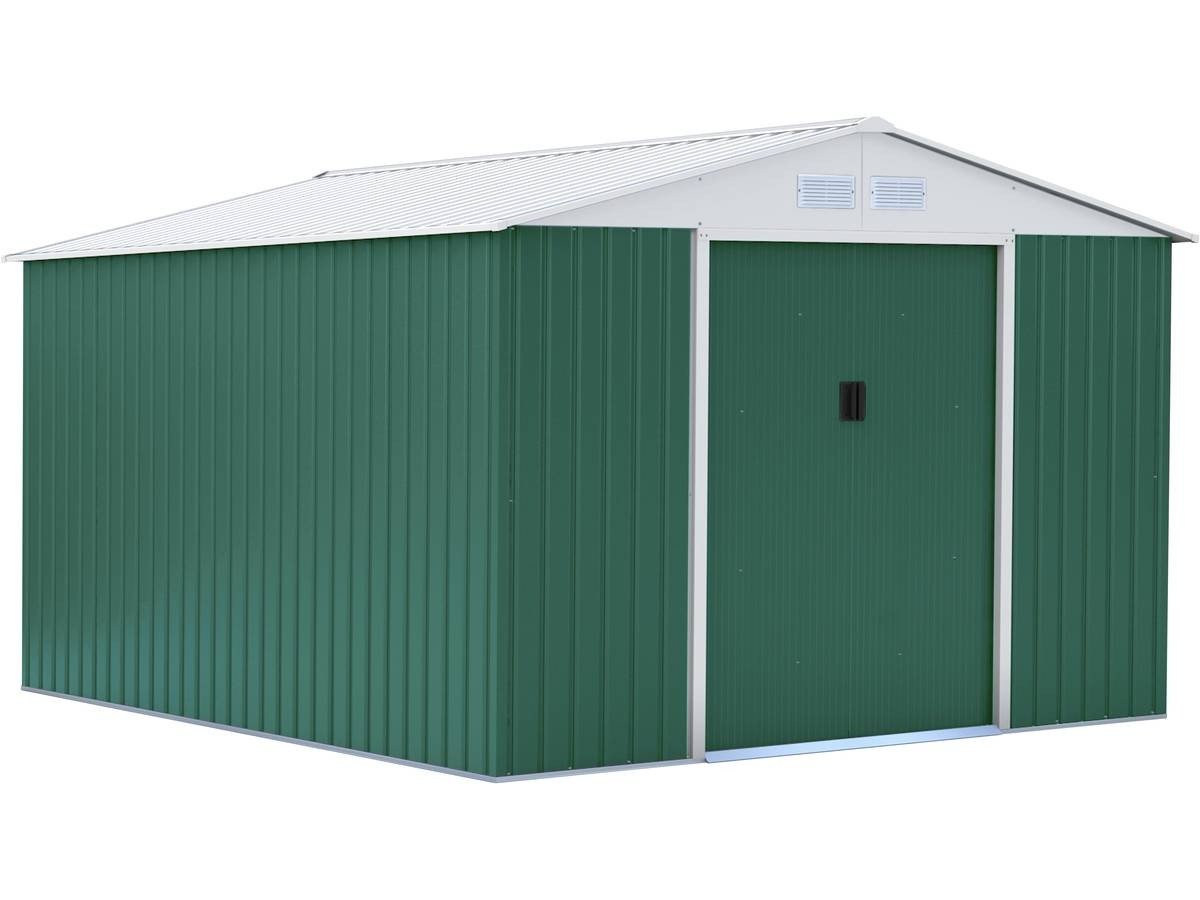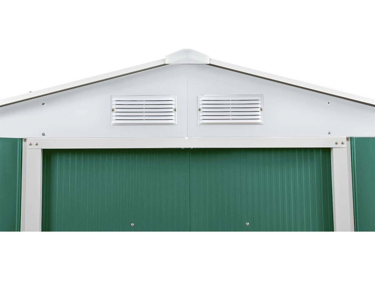 Caseta de metal para jardín color verde y blanco – Dimensiones de punta a punta: 3,19 x 3,40 x 2,10 – Kit de anclaje para concreto incluido.