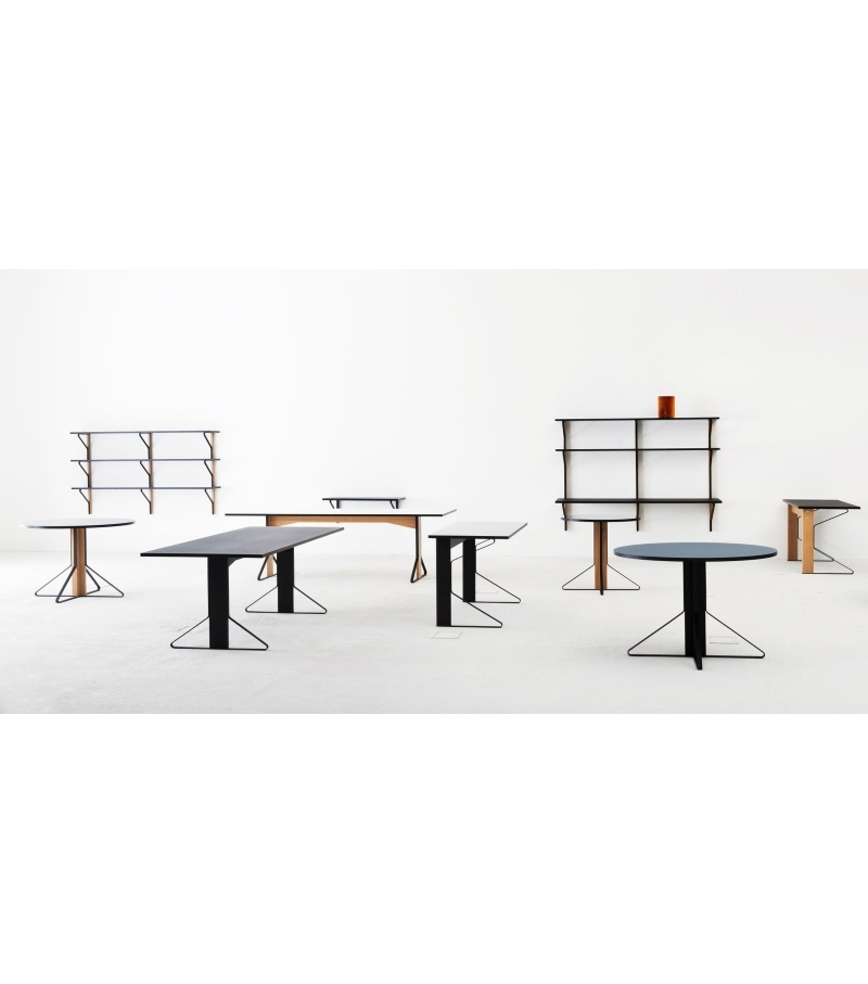 REB 013 Kaari Shelf with Desk combine fonctionnalité scandinave et élégance graphique dans création signée Ronan & Erwan Bouroullec pour Artek. Alliance entre bois naturel et métal incurvé crée équilibre visuel unique entre chaleur organique et structure industrielle légère. Forme simple, silhouette claire et proportions réfléchies permettent intégration fluide dans intérieur contemporain, bureau personnel ou espace de vie multifonction.
