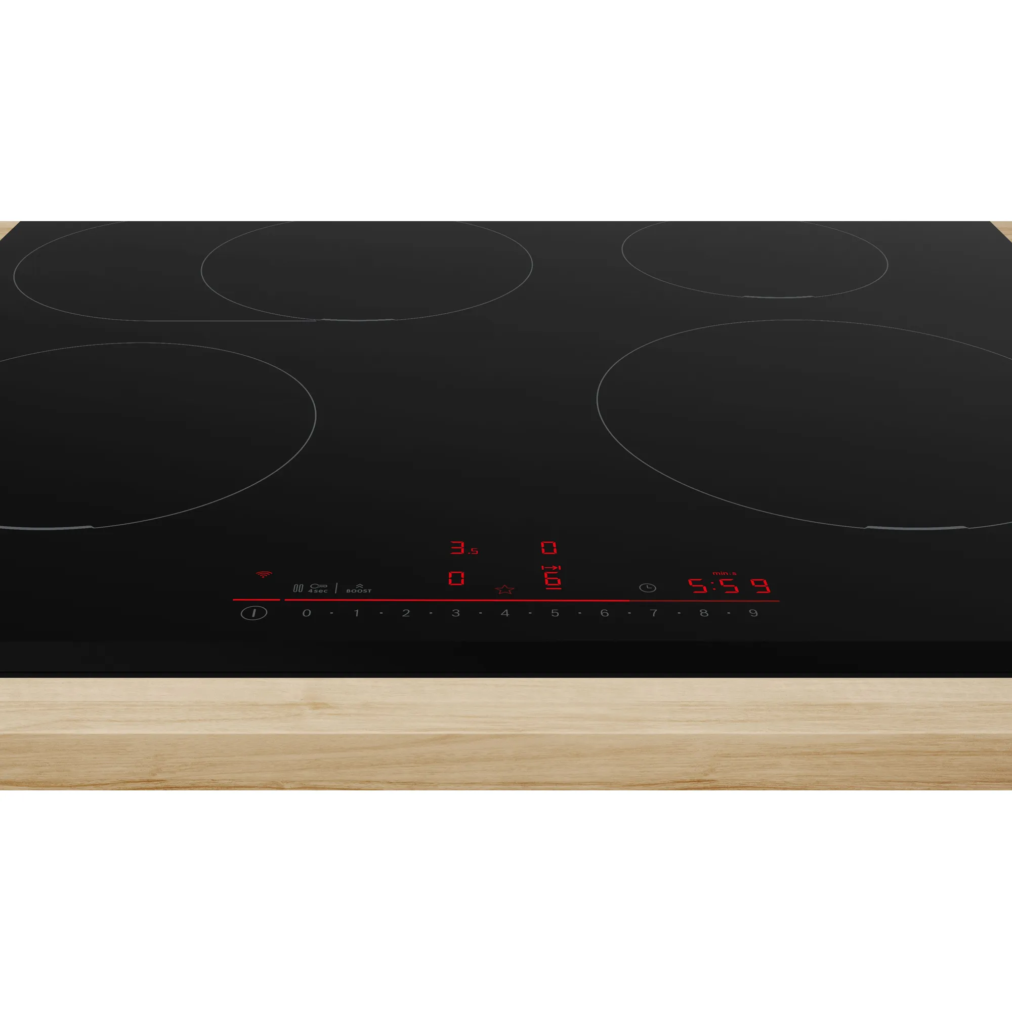 Inductiekookplaat Serie 6 met 4 zones, 1 perfectBake braadzone, powerBoost-funxtie alle zones, pan Boost,quicl- en reStart functie, directSelect, 17 vermogensstanden, warmhoud-functie, timer, facet voor, Hood Control en HomeConnect.