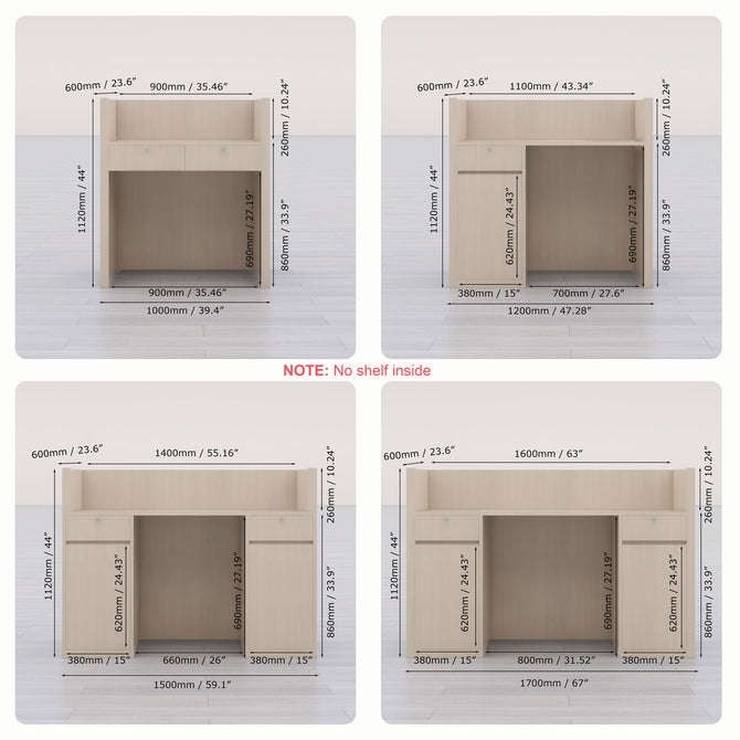 Fabrication en bois stratifié ou massif selon personnalisation, finitions disponibles en tons clairs nordiques, essences naturelles ou textures foncées pour ambiance contemporaine ou chaleureuse. Façade plane, parfois agrémentée de détails en relief, panneaux rainurés ou inserts métalliques, offre esthétique sobre et professionnelle. Plateau supérieur sert de comptoir pour interaction client, tandis que surface inférieure accueille matériel informatique, accessoires de bureau et documents essentiels.