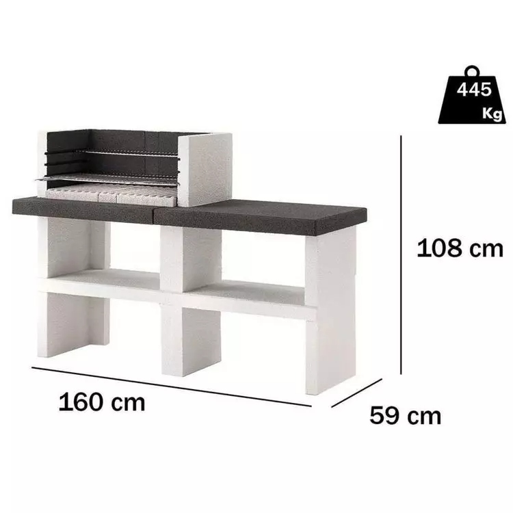 Barbecue sans hotte ligne design, livré en kit de montage. Structure réalisée en mélange de béton et matériau réfractaire, les plans de travail sont en Marmotech (un mélange de granulats de marbre très résistant) et sont teintés dans la masse anthracite. Equipé d’une grande grille de cuisson 76 x 40 cm réglable sur 2 niveaux + 1 grille chauffe-plats. Seuls les piètements et le foyer sont à protéger en appliquant une couche de 3-4 mm de crépi au quartz imperméable pour l’extérieur (non compris) et le plan de travail est à imperméabiliser en appliquant une couche de liquide hydrofuge transparent (non compris).