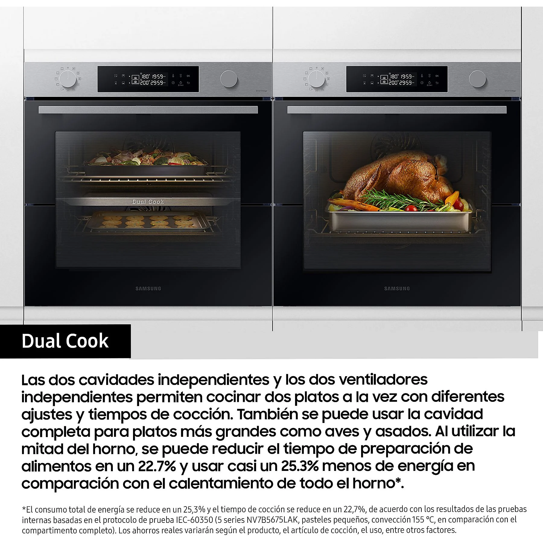 El consumo total de energía se reduce en un 25,3% y el tiempo de cocción se reduce en un 22,7%, de acuerdo con los resultados de las pruebas internas basadas en el protocolo de prueba IEC-60350 (5 series NV7B5675LAK, pasteles pequeños, convección 155 ℃, en comparación con el compartimento completo). Los ahorros reales variarán según el producto, el artículo de cocción, el uso, entre otros factores.