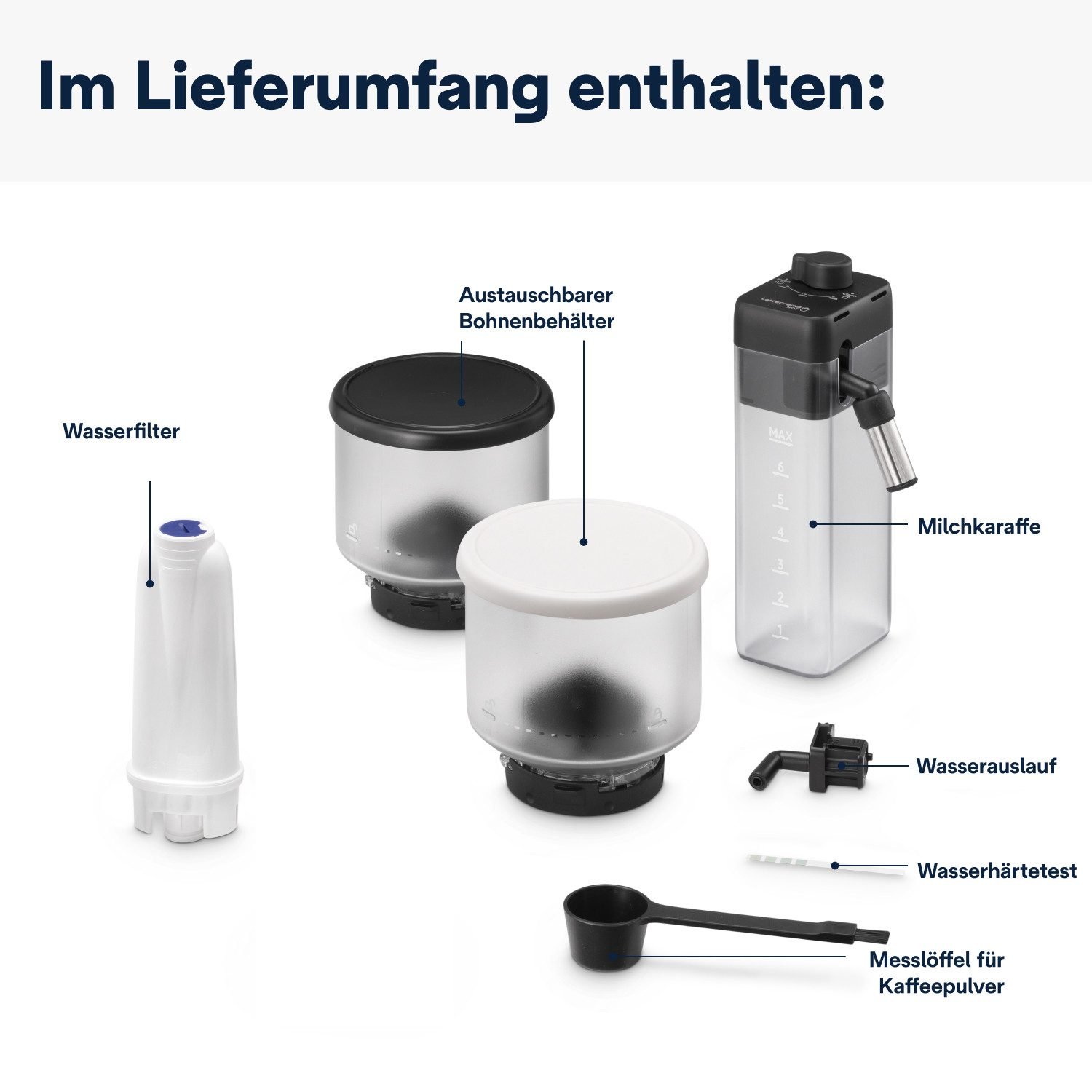 | Mitgeliefertes Zubehör | Bedienungsanleitung Heißwasserauslauf Kaffeemaß Schutzdeckel für Mahlwerk Wasserfilter Wasserhärtestreifen abnehmbarer Trichter für Kaffeepulver zusätzlicher Bohnenbehälter |